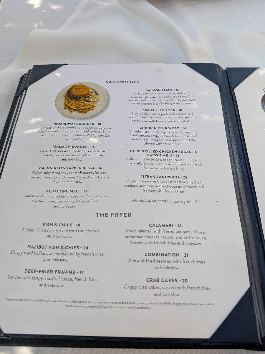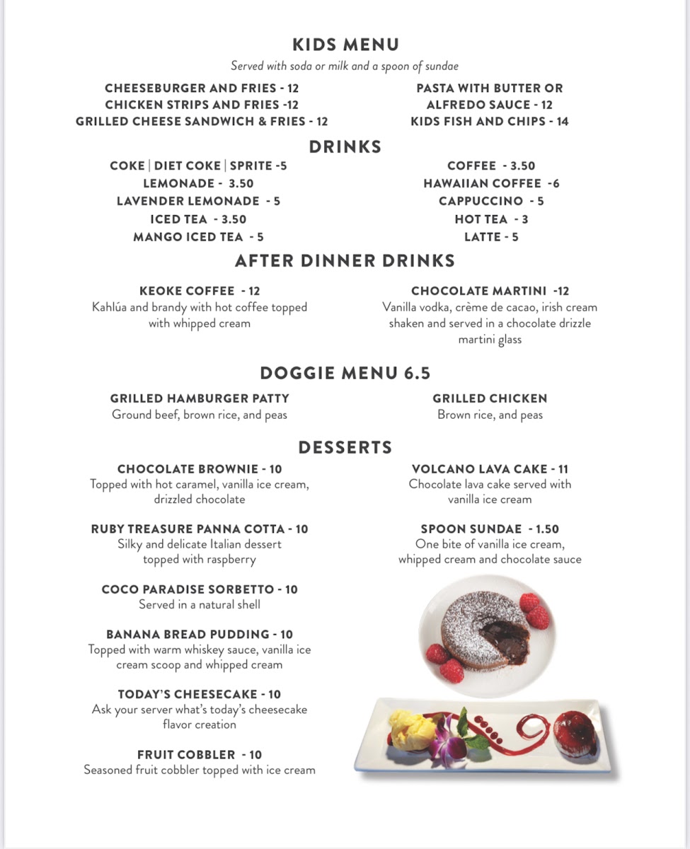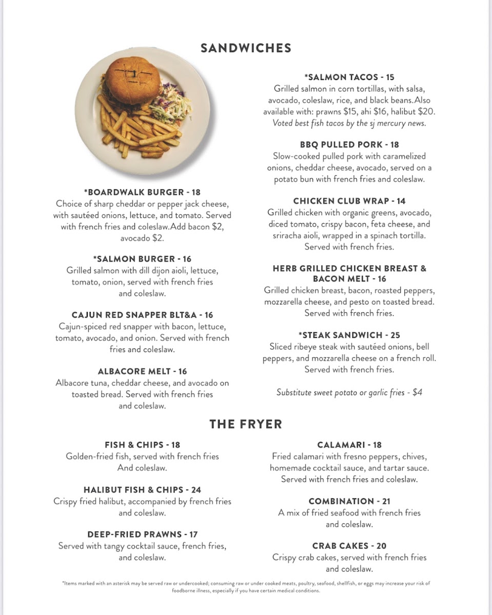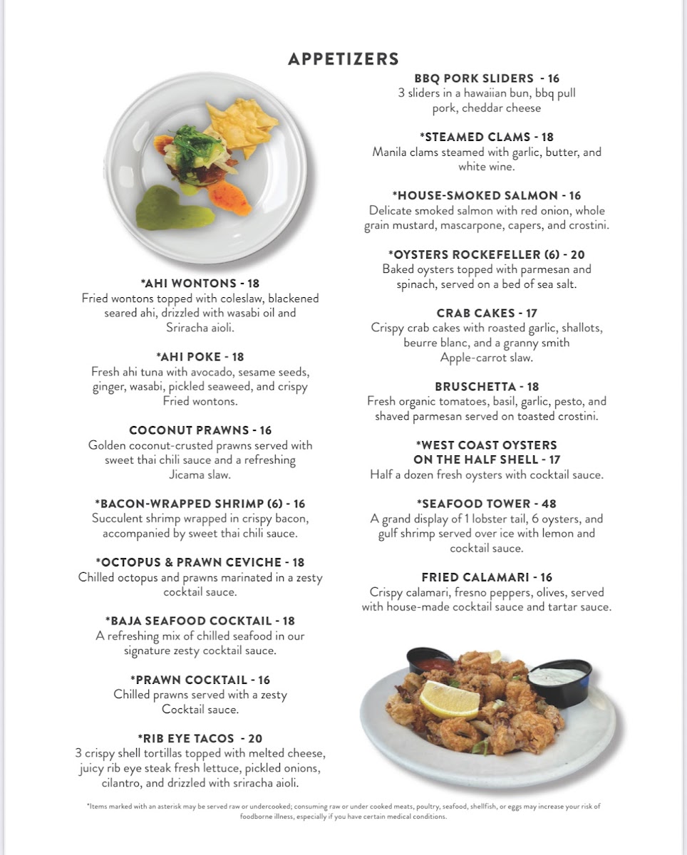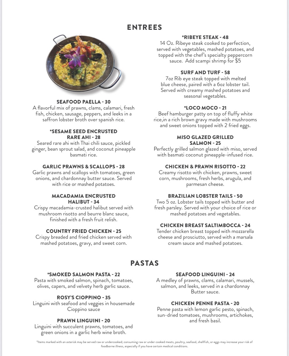 Highlights include items like the hearty Seafood Paella, crisp Fish & Chips, and flavorful Shrimp Tacos, which pair well with the welcoming and cozy atmosphere. Fresh and light options such as the Dungeness Crab Louie Salad or the Wedge Salad provide satisfying choices during sunny afternoons or lighter meals. For those seeking robust flavors, Rosy's Cioppino or the Macadamia Encrusted Halibut offer a more indulgent experience that matches the restaurant’s slightly upscale but approachable vibe.